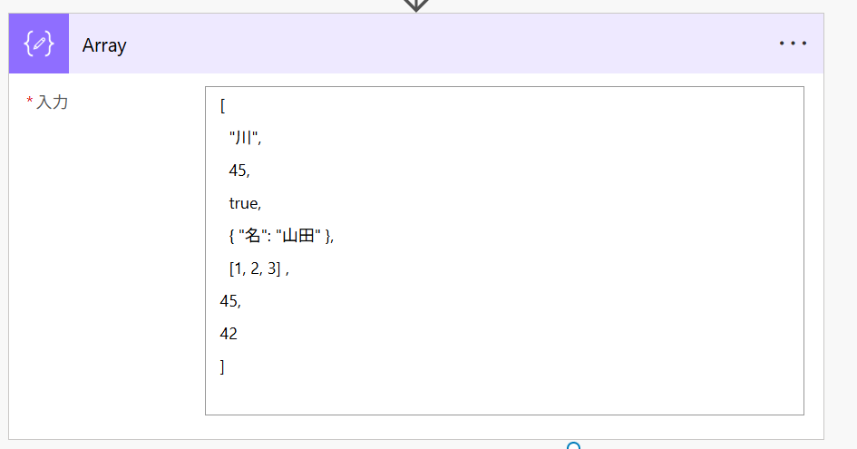 出力: [42, 45, [1, 2, 3], {“名”: “山田”}, true, 45, “川”]