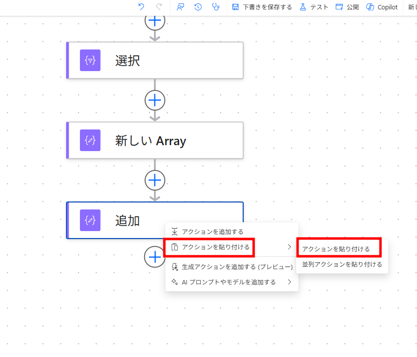 これにより、アクションを再度選択検索したり、式を一から記述したりする時間を削減できます。