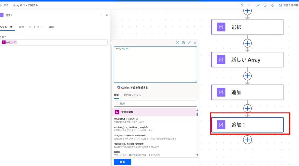 以下は2つの数字を加算する「作成」アクションです