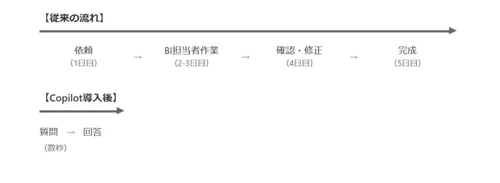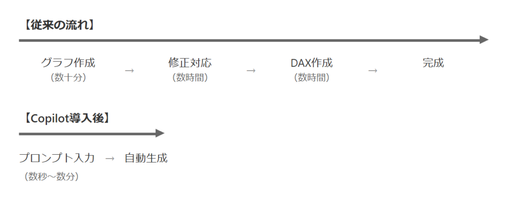 当社がCopilotに注目する理由は、データ分析者と経営層の両方にメリットがある点です。分析者にとっては、グラフ作成やDAX数式の試行錯誤が大幅に減り、素早くデータを視覚化できます。経営者やマネジャーにとっては、必要な分析結果を自分の言葉で要求し、その場で視覚化されたデータをそのまま経営会議に掛けられることが期待できます。