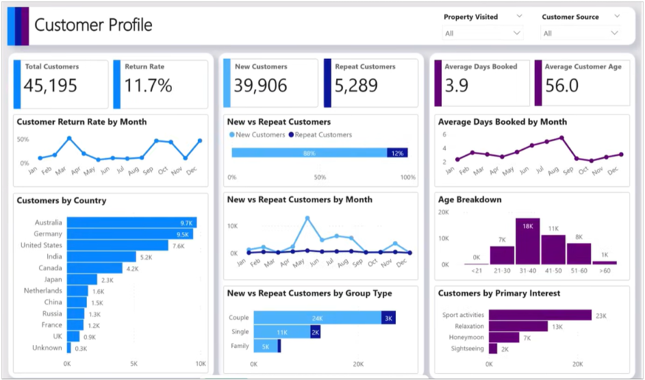 – KPIカード:総顧客数(45,195)、リピート率(11.7%)、平均滞在日数など