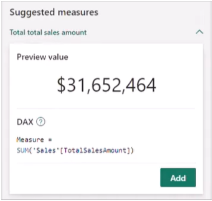 Quick measure のところで Suggestions with Copilot を選択し、プロンプトとして「total sales」と入力すると、対応する measure が提案されます。