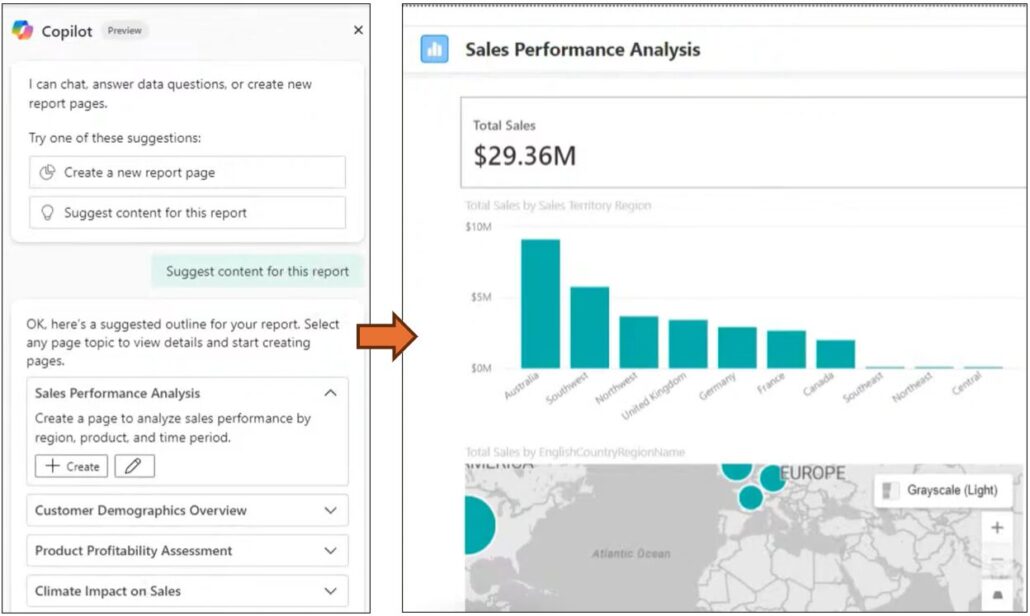 「何を分析すべきかわからない」という場合に、Copilotがレポート構成を提案する機能が紹介されています。「Suggest content for this report」をクリックすると、Copilotがデータに基づいて、Copilotが4つのページ案を提案。「+ Create」をクリックするだけで、選んだ分析ページが自動生成される。