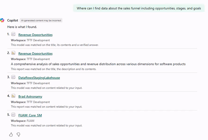結果:Copilotが関連するレポート・データセットを自動検索し、一覧表示