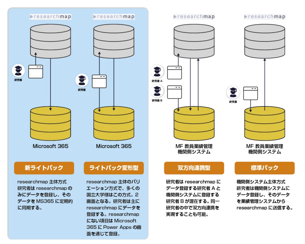 研究者の業績管理システムとresearchmapとの連携形態は、researchmap主体にして、あるいは、機関側システムを主体にしてデータを登録していくかで複数の形態が考えられます。当社は以下のようにシステム構成によって様々な連携形態を実現できます。その中で下記の左端のライトパックは、完全なresearchmap主体方式で、コストパフォーマンスが高いため、まずこの方式で実現できないかをご検討いただければと思います。