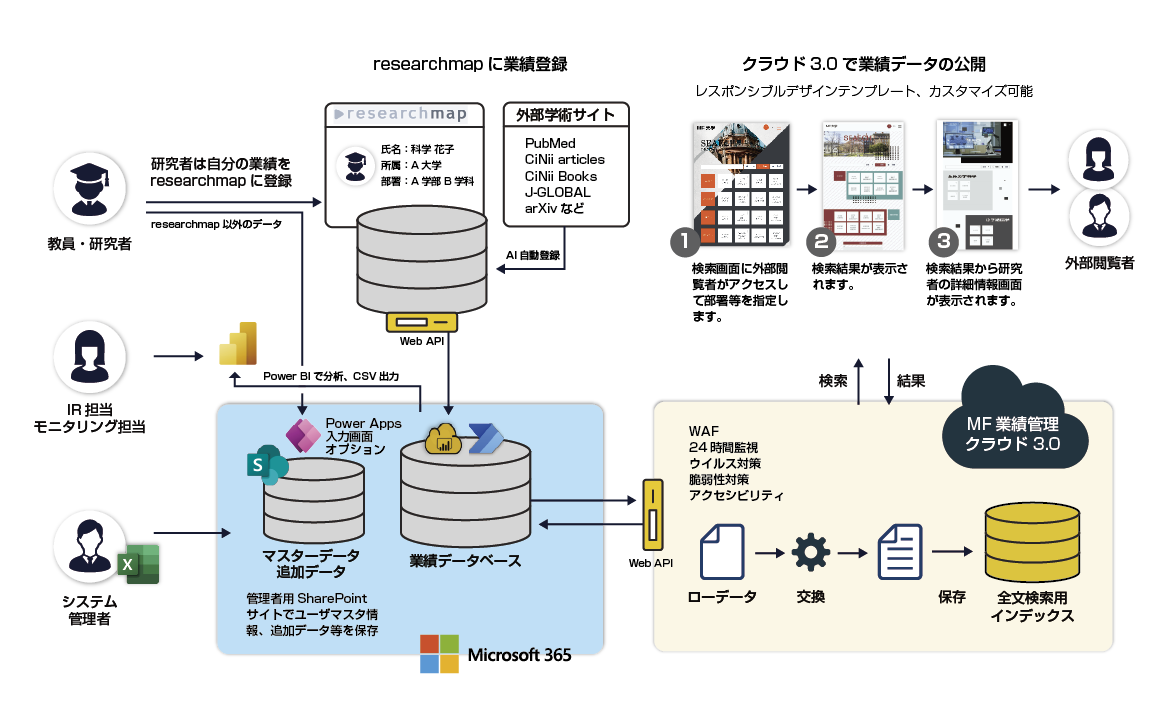 | ① | 新しいクラウド方式SEaaS (SaaS Extension as a Service) の業績管理システム 業績データは、利用機関側のMicrosoft365に蓄積し、研究者情報の外部公開は当社の 「MF業績管理クラウド3.0」で行います。従来のクラウドサービスと異なり拡張性を維持しつつサーバレスを実現したプラットフォーム拡張型サービスです。教員数は最大2000人まで対応します。 |