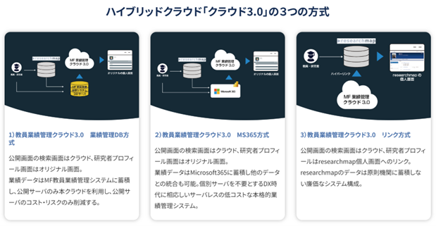 | 概要 | 大学・研究機関向け教員(研究者)業績管理システムの外部公開機能のクラウドサービス。DBサーバをオンプレミス、IaaS、Microsoft 365(SEaaS)から選択し、ハイブリッドクラウド形式の業績管理システムを構築する。 |
