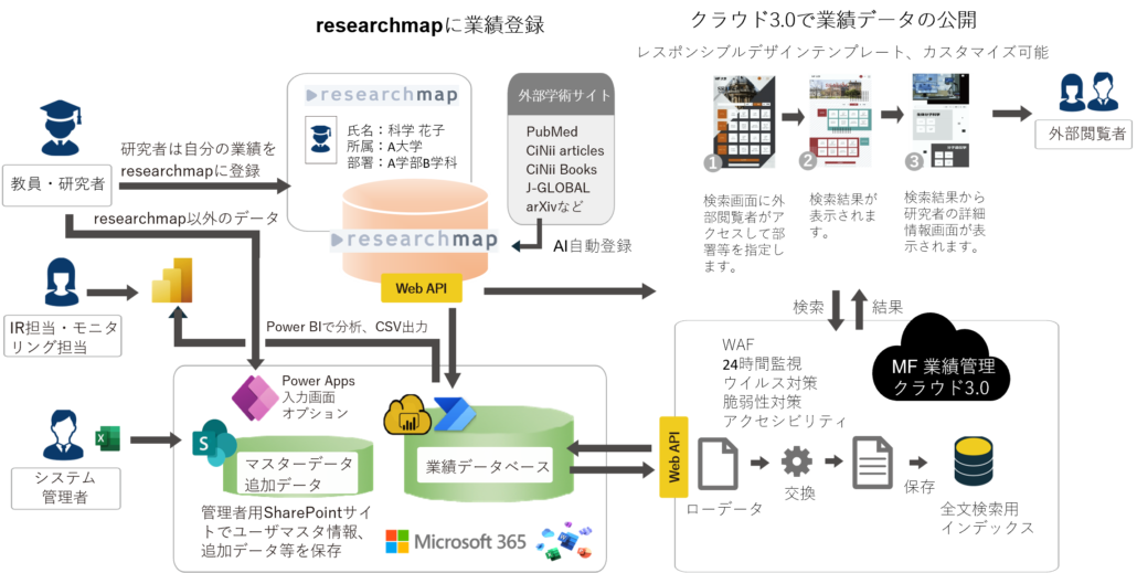 - ハイブリッド構成による安全な外部公開:登録した業績の外部公開機能に関しては、Microsoft 365上で実現しようとすると運用費が非常に高額になるため、これは弊社の外部公開クラウドサービス「クラウド3.0」を利用します。