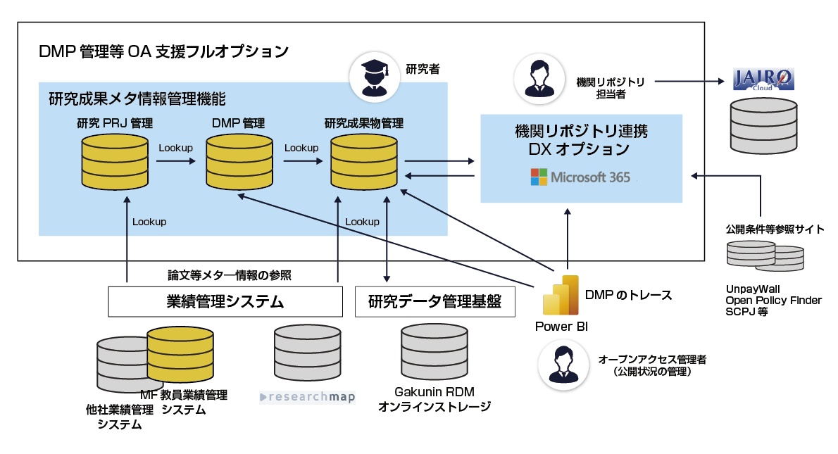 DMP(Data Management Plan:研究データ管理計画※)から公開工程を一元管理できるOAフルオプションです。オンプレミスのMF教員業績管理システムのオプション機能となります。このオプションは、機関リポジトリ連携DXオプションを含んでいます。