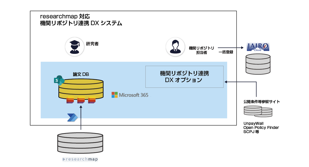 機関リポジトリ連携DXオプションとresearchmap対応機関リポジトリ連携DXシステムは、Microsoft365上に構築されます。特別にサーバを用意することなく、SharePoint上に構築し、MS365の認証、アクセス管理を利用して運用されます。システム管理者は、機関リポジトリ業務のフローや内容の変化に柔軟に改造することが出来ます。
