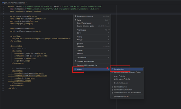 pom.xml の <dependencies> … </dependencies> タグ内に、JUnit 5、RestAssured、Jackson Databind を追加します。これらの依存関係を設定することで、