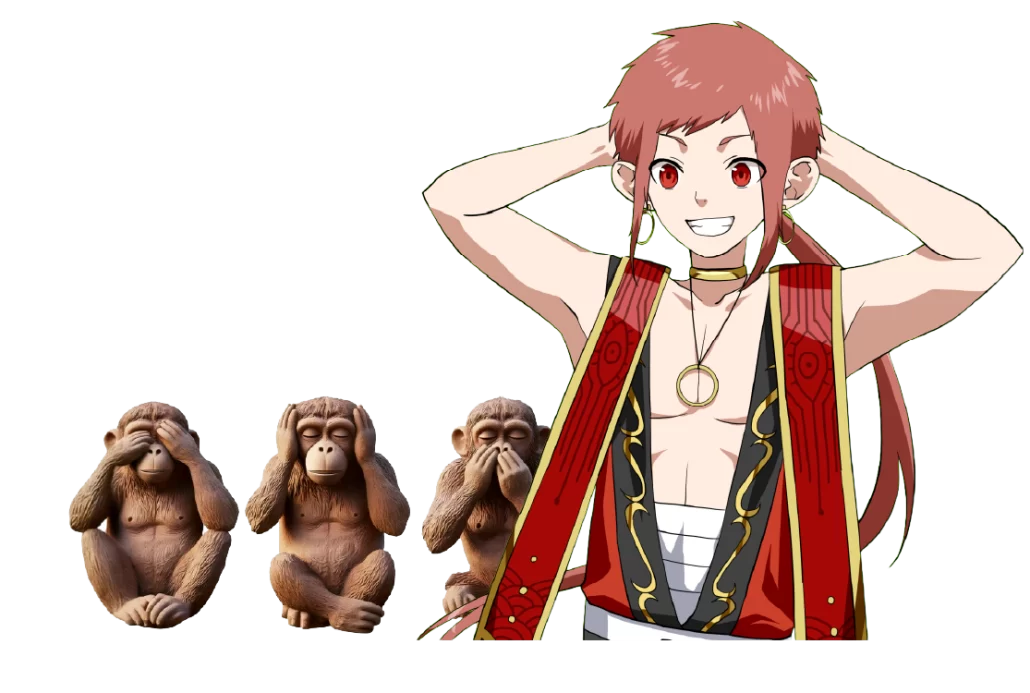 12支族の猿族、好奇心旺盛で社交的。特殊能力「見ざる言わざる聞かざる」を用いて常人では見えない、言えない、聞こえないものを感じることができる。生業は、もちまえの社交性を活かした居候。